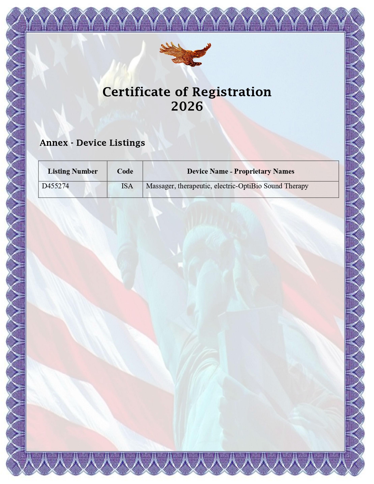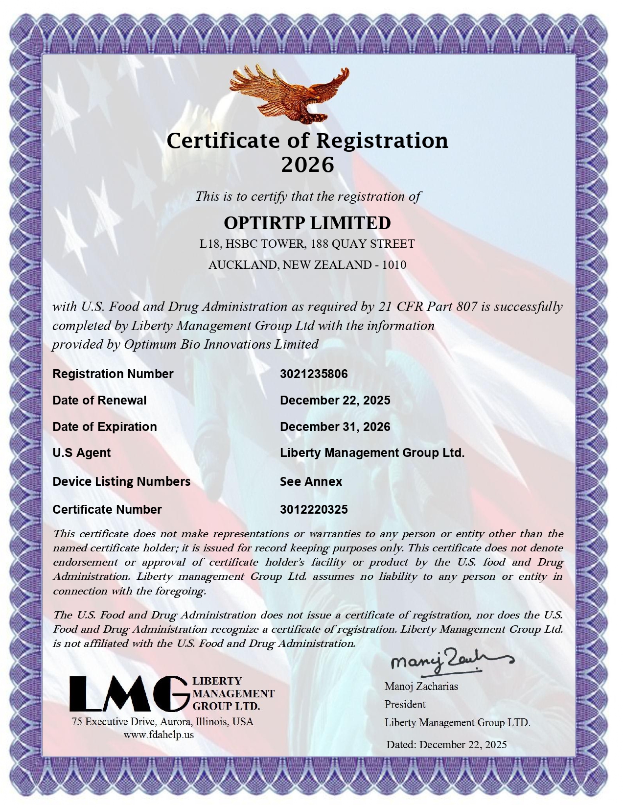 Certificate of Registration for FDA